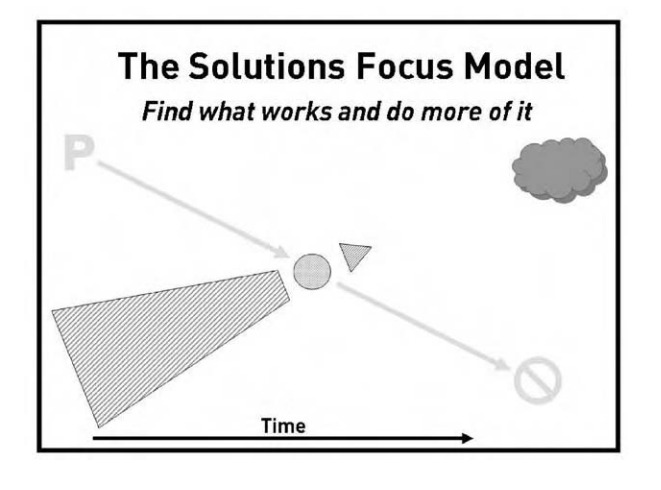 The shape of a pyramid suggests something solid and unchangeable. SF is reduced to a four-step approach and it remains unclear why the shape of a pyramid was chosen except to signify that every conversation rests on a ground consisting of “the problem and all the experiences that have already been made with it.” (Ibid) This diagram runs risk of taking “the problem” as the foregrounded reason for the conversation whereas SF generally invites a focus on what is wanted rather than what is not wanted. It also remains unclear why the shape of a pyramid was chosen except, maybe for branding reasons in an attempt to differentiate the diagram from other existing models.