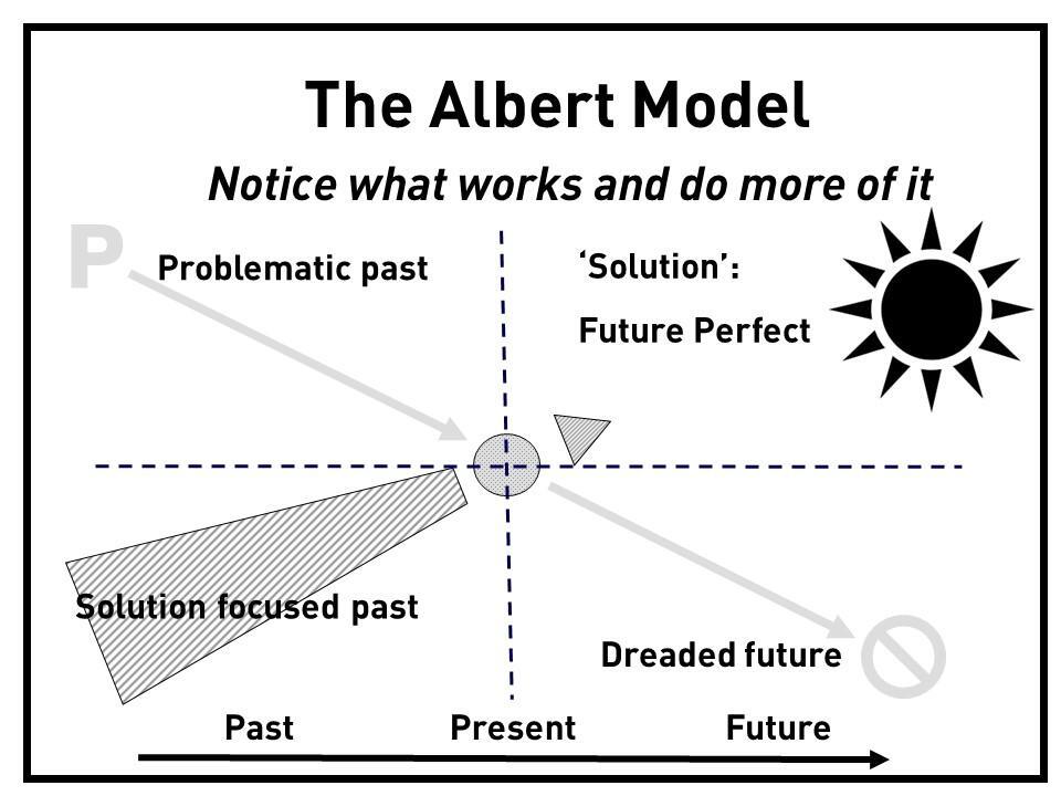 The Albert Model, which was still called “The Solutions Focus Model” in The Solution Focus 2nd edition (Jackson & McKergow, 2007, p. 3), went through a few iterations in the following editions of the book. The diagrams depicted above are from 2007, when the diagram appeared first in the second edition of the book, and from the most recent edition of 2024. The first edition of The Solution Focus book did not contain this diagram. Mark McKergow told me that he first drew this model in 2003 on a whiteboard during a seminar at the Said Business School in Oxford. He was showing it to Bristol Solutions Group colleagues later and one of them (Harry Norman) asked “What are you going to call it?” Mark was fond of using Albert Einstein’s unverifiable quote that “Everything should be made as simple as possible but no simpler”, and so he said (jokingly) “Albert!”. The name stuck.