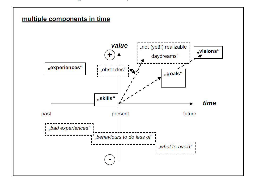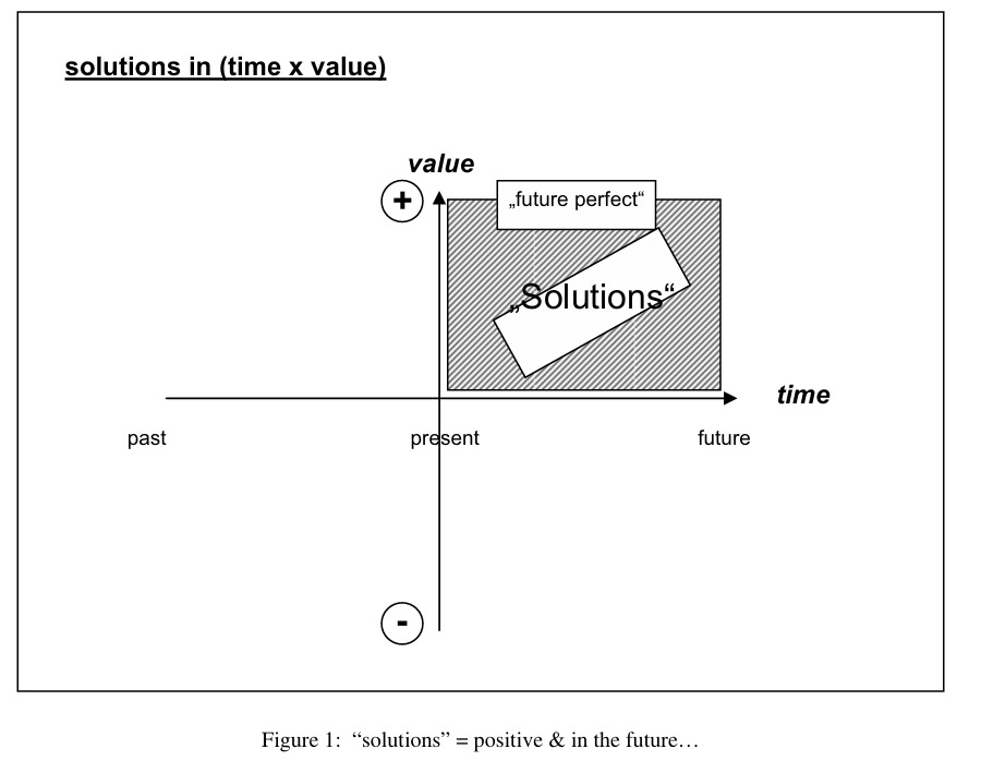 Klaus Schenk’s “SF Matrix” as it came to be known in later years was called “Solutions Landscape” in the original publication. It uses a similar structure as the Albert Model, however in this diagram both x and y axis can be labelled. The x axis is “time” and the y axis is “negative – positive”. In the top right corner, we find “solutions”. According to Schenk "Many ingredients may contribute to a solution: things, people, skills, past experience, money, energy, creativity…, collectively called resources. Resources and elements of the desired solution may be found in all times, all along the “time”-axis or “timeline”. Those from the past may be called “experiences”, those in the present “skills”, those from both the past and present “exceptions”, and those for the future “visions” or “goals” (Schenck, 2006, p. p.28), which he depicts in the second diagram.