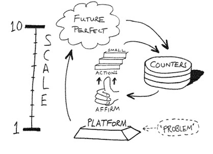 This flowchart starts from “problem”, in quotation marks and in within a dotted circle. This already signals that “the problem” does not need to be talked about much in an SF conversation. The first no-dotted item is the platform, “a point of departure for our process of searching for what works.” (Jackson & McKergow, 2007, p. 18). The next item is the “Future Perfect”, a description of the preferred future without the problem. Next is “Counters”, all the resources, skills, know-how and expertise (Ibid) which line up on a scale which we can see depicted on the left side of the diagram. The scale overarches the whole flowchart from 1 (the level of the problem) to 10 (the level of the future perfect). The last two items are “Affirm” and “Small Actions”.