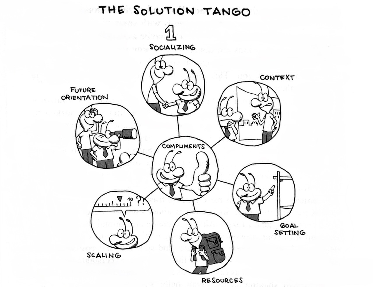 The Solution Tango likens SF practice to a non-choreographed dance with two partners (a leader and a follower). The leader extends invitations, and the follower follows (or not). The metaphor of a “dance” stresses the co-creation between practitioner and client in line with the social constructionist philosophy on which SF is built. The diagram centres “compliments” and organizes other “tools” around it. In the descriptive text (Cauffman & Dierolf, 2006, pp. 47–111), we can find a seven-step structure, which is not intended to be sequential.