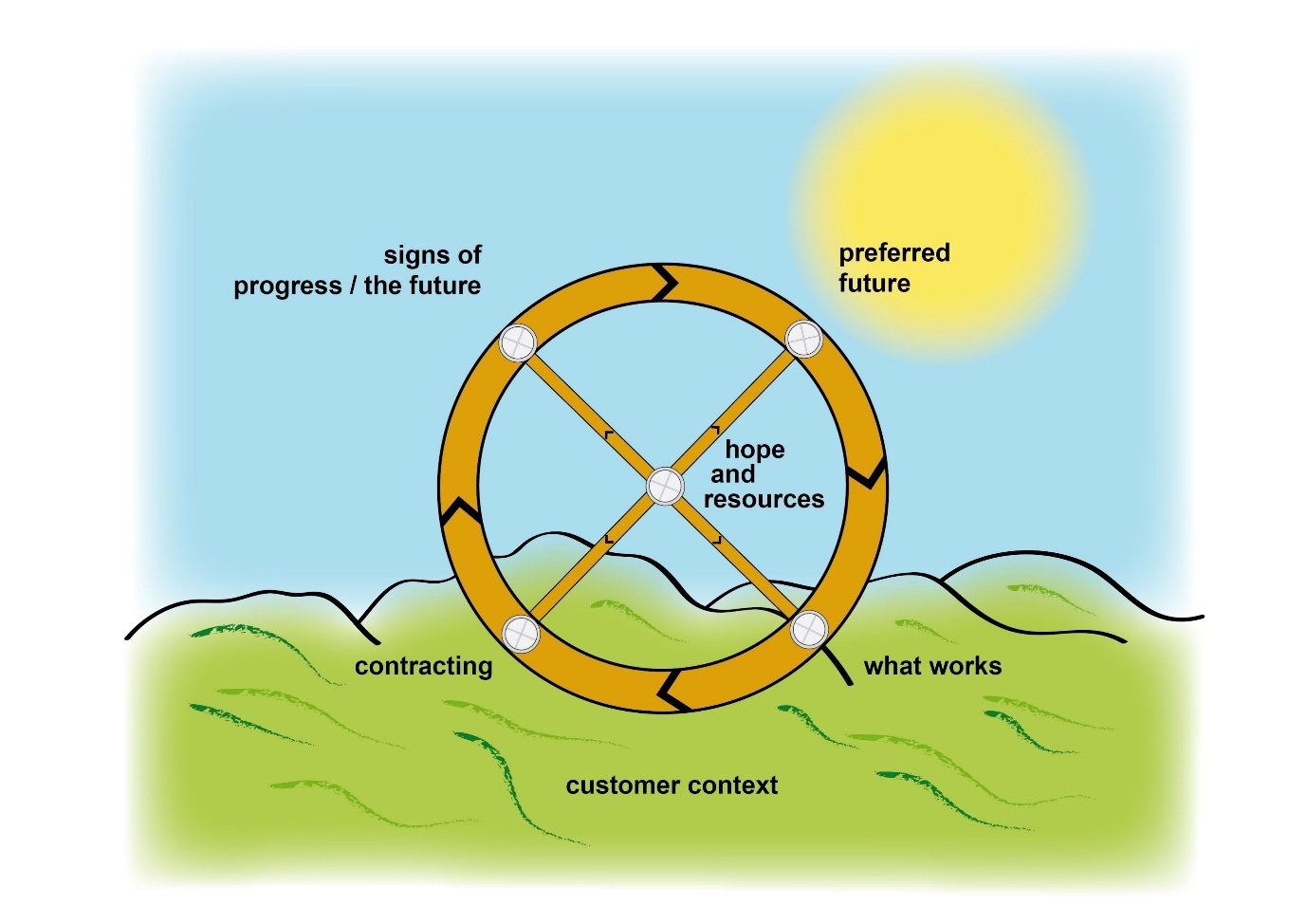 The SF Wheel (Burgstaller, 2015) is a circular model emphasizing systemic and iterative dimensions of SF in organisations. The wheel reflects SF’s recursive nature. It differentiates the ground and the sky, with the sun being identified as a hopeful “Preferred future”. On the wheel, we can find the customer context in the ground and as a first starting point toward moving upward into the sky, we have contracting. After that, signs of progress / the future, the preferred future in the sun, hopes and resources moving downward and “what works” back in the ground.