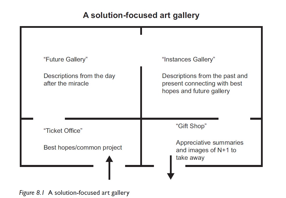 Moving from tools to descriptions is very much in line with the more recent elements of SF practice. The “Art Gallery” visualisation allows practitioners to work in a loose structure and keep in mind the invitation for clients to talk about descriptions of positive past and future oriented at their objectives. It is both flexible and clear and does not fall into the trap of over-structuring SF practice. With the “Art Gallery” metaphor every practitioner can find their own way of invitations to clients.
