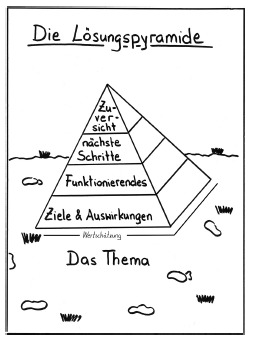 Miarka and Jungwirth’s “Lösungspyramide” (Solution Pyramid) illustrates the SF process as founded on “the topic” (das Thema) and “Wertschätzung” (appreciation). The various layers of the pyramid are: “goals and consequences”, “what is working”, “next steps”, “confidence”. Miarka and Jungwirth state that “Every solution-focused conversation essentially goes through four phases.” (Miarka & Jungwirth, 2022, p. 63).