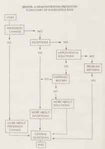 The first attempt at a visualisation of the SF process as a flow chart was within the framework of the “Briefer Project” in which Steve de Shazer attempted to create a decision tree for SF practice. In this diagram, you can see what guides the decisions of a practitioner in a conversation. If the client talks about presession change, the practitioner will ask more questions about presession change. If not, they will ask about exceptions. If there are no exceptions, the practitioner will enquire about hypothetical solutions, etc. This is all followed by “general questions”.