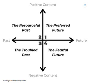 Haesun Moon’s “Dialogic Orientation Quadrant” popularized the structure originally designed by Klaus Schenck. Her diagrams (Moon, 2017, 2020) combine language of the Albert Model (Jackson & McKergow, 2007) “dreaded future” and the structure of Schenck’s Solutions Landscape (Schenck, 2006). The difference between Jackson & McKergow’s quadrant and Moon’s dialogic quadrant is that in Jackson & McKergow’s quadrant, the solution axis is going “Up” and the problem axis going “Down”. Moon and Schenck’s orientation is a traditional four field matrix, which makes acceptance in management circles easier, while Jackson & McKergow’s quadrant is visually more appealing as the “positive” movement is going “up”.